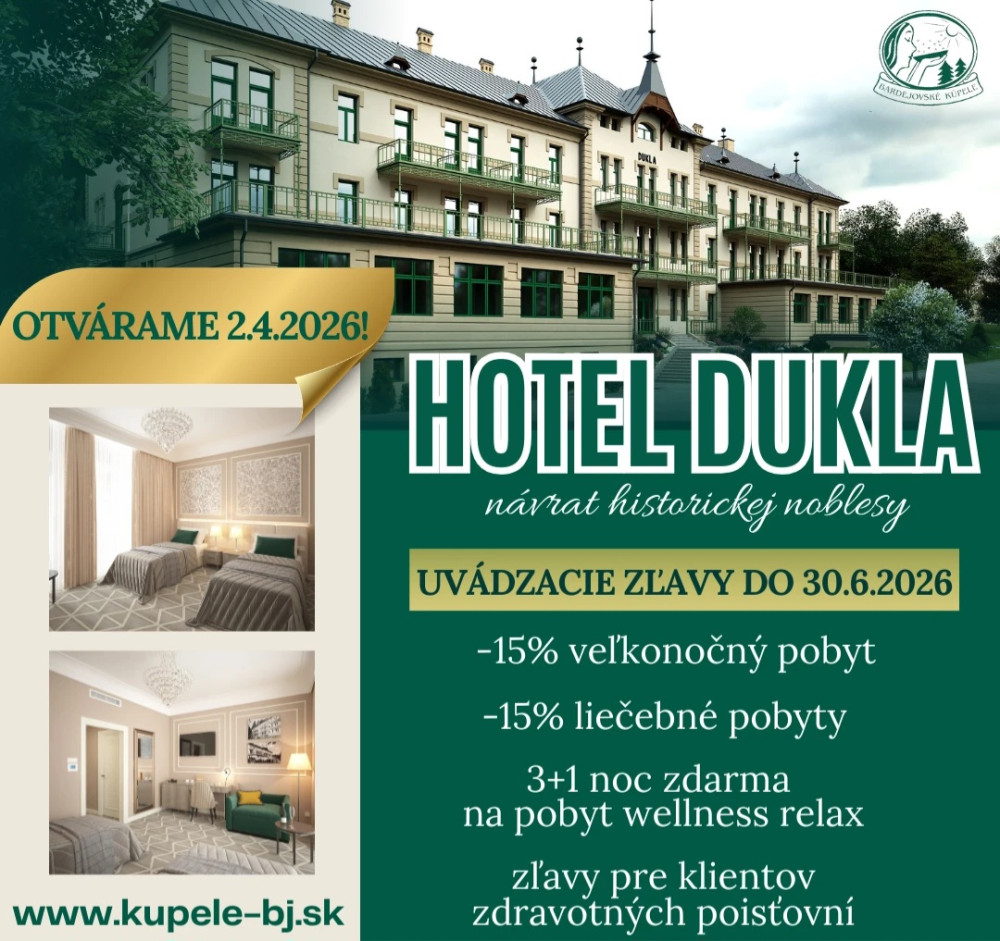 NAS NÁZOR NA ZARIADENIE Hotel Dukla***+ je zaujímavým prírastkom do ponuky ubytovania v Bardejovských Kúpeľoch. Keďže ide o novootvorený, kompletne zrekonštruovaný hotel, naše hodnotenie zatiaľ vychádza najmä z dostupných informácií o vybavení, polohe a plánovaných službách. Vnímame ho ako moderné a komfortné ubytovanie v atraktívnom kúpeľnom prostredí, ktoré má potenciál osloviť klientov hľadajúcich pokoj, kvalitu a tradičnú kúpeľnú atmosféru. Reálne skúsenosti hostí budeme môcť objektívne zhodnotiť až po jeho otvorení a prvých pobytoch. | PREČO SI VYBRAŤ TOTO ZARIADENIE