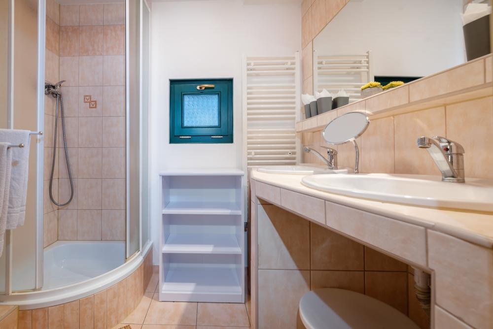 - Štvorspálňový apartmán : tri trojlôžkové spálne (1x manželská posteľ, 1x samostatné lôžko / 3x samostatné lôžko), štvorlôžková spálňa (1x manželská posteľ, 1x samostatné lôžko), spoločenská miestnosť (krb, SAT/TV, gauč, CD prehrávač, spoločenské hry), 2x kúpeľňa a 3x samostatná toaleta, WiFi, chladnička, kanvica