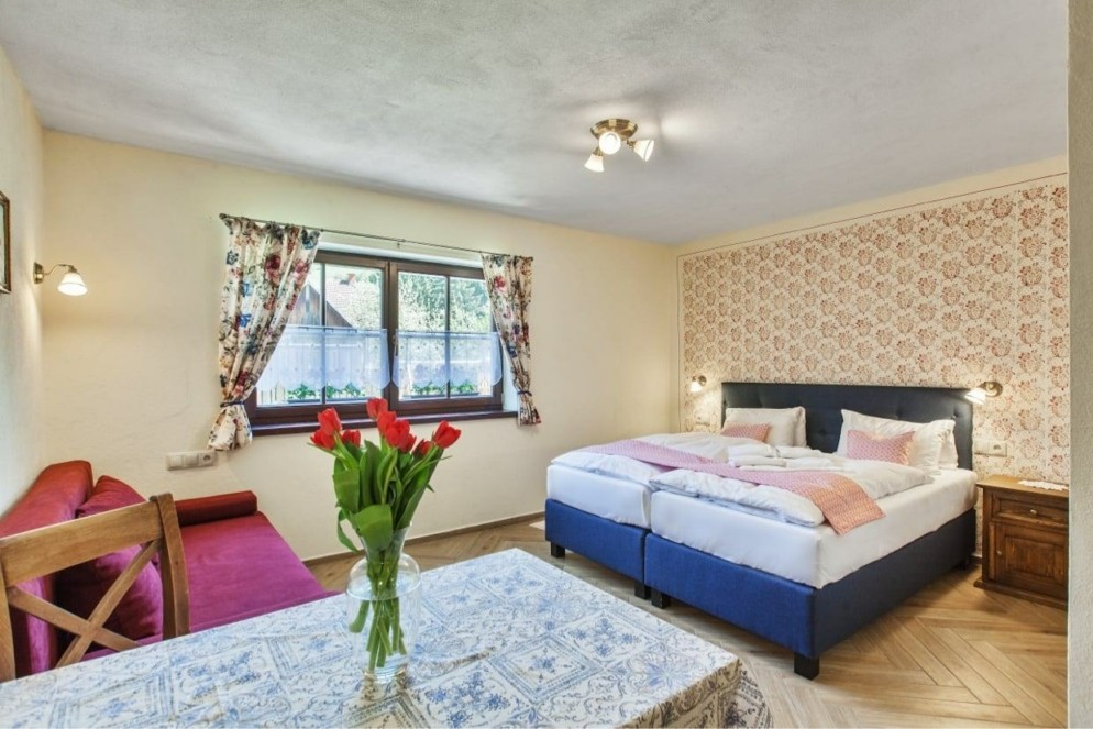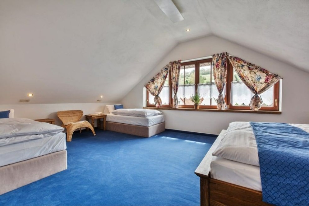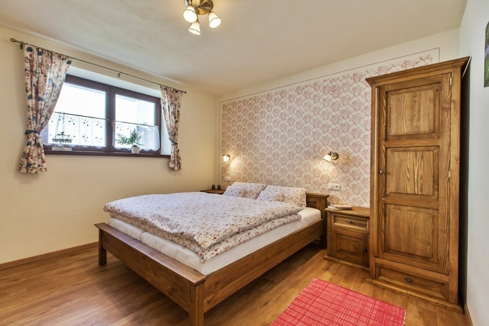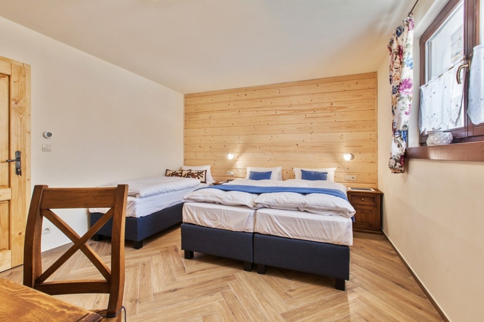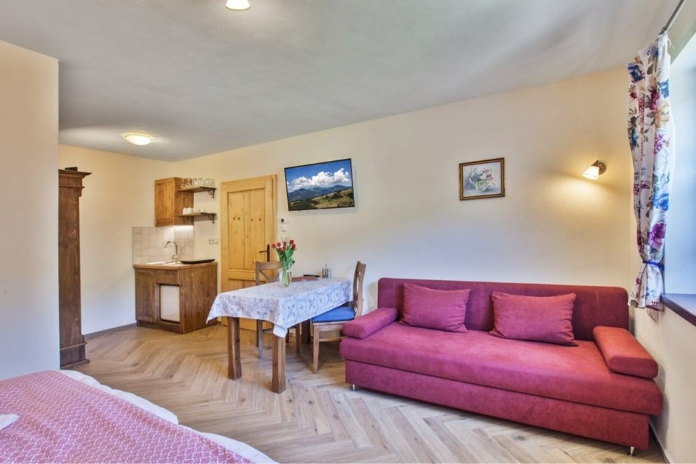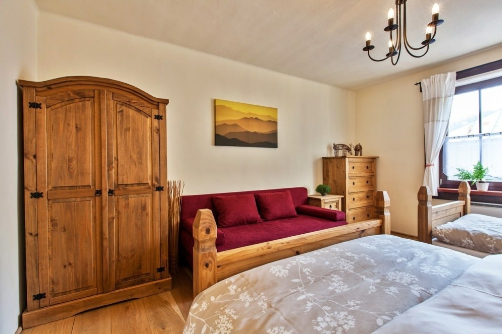 4-lôžková rodinná spálňa (1x manželská posteľ, 2x jednolôžko) s panoramatickým oknom, obývačka s veľkým rozťahovacím rohovým gaučom pre 2 osoby, kuchynka, kúpeľňa so sprchovým kútom, televízor, WiFi - Rodinný apartmán (na poschodí)