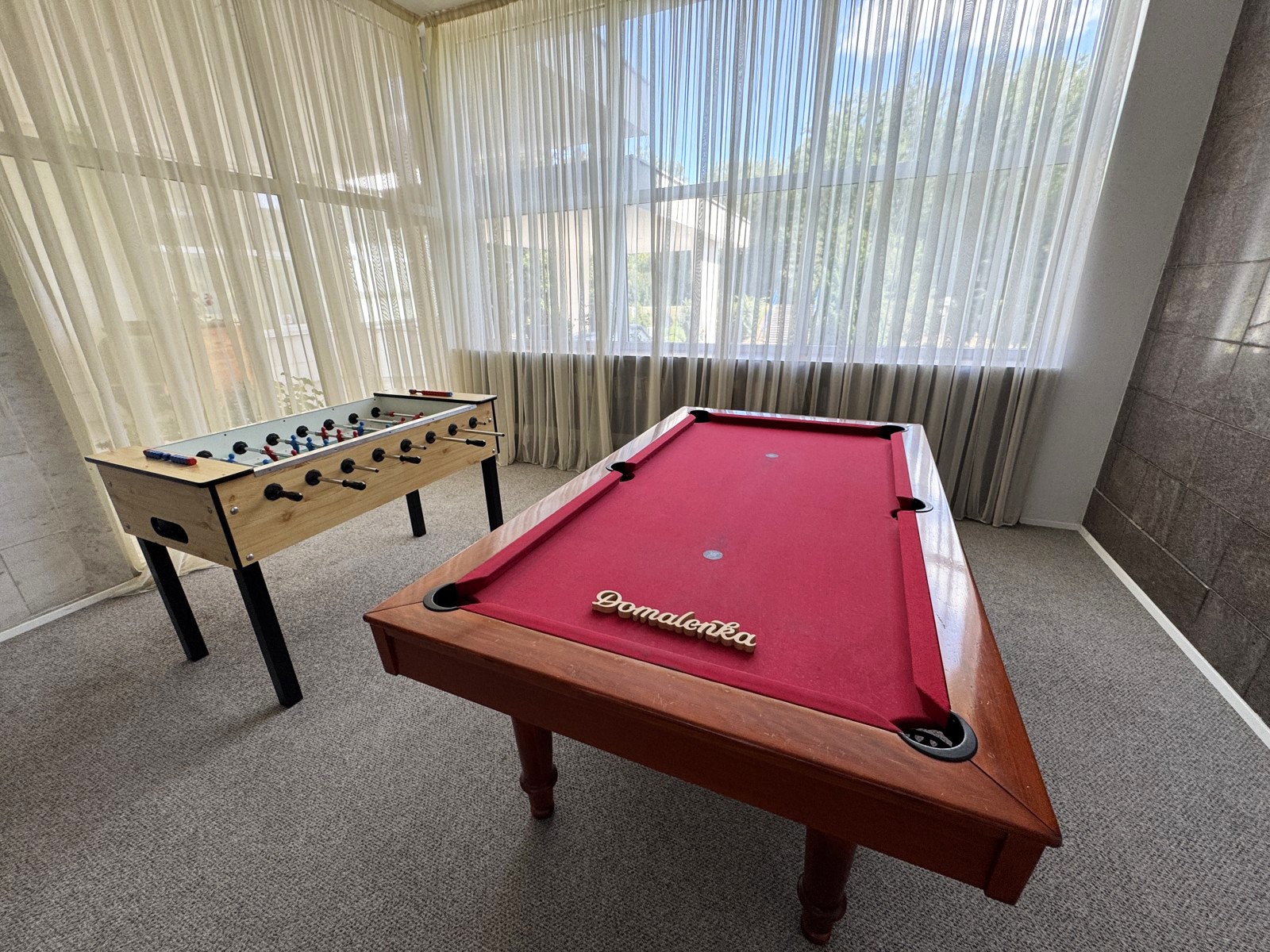 - relaxačný bazén s vodnými atrakciami, vodopádom, dnovým gejzírom a vodnými kreslami s perličkovou masážou a hydromasážou, teplota vody 31°C, z bazénovej haly je priamy vstup na letnú terasu (rozmery bazéna - 16 m x 8,3 m, hĺbka 1,2 m)