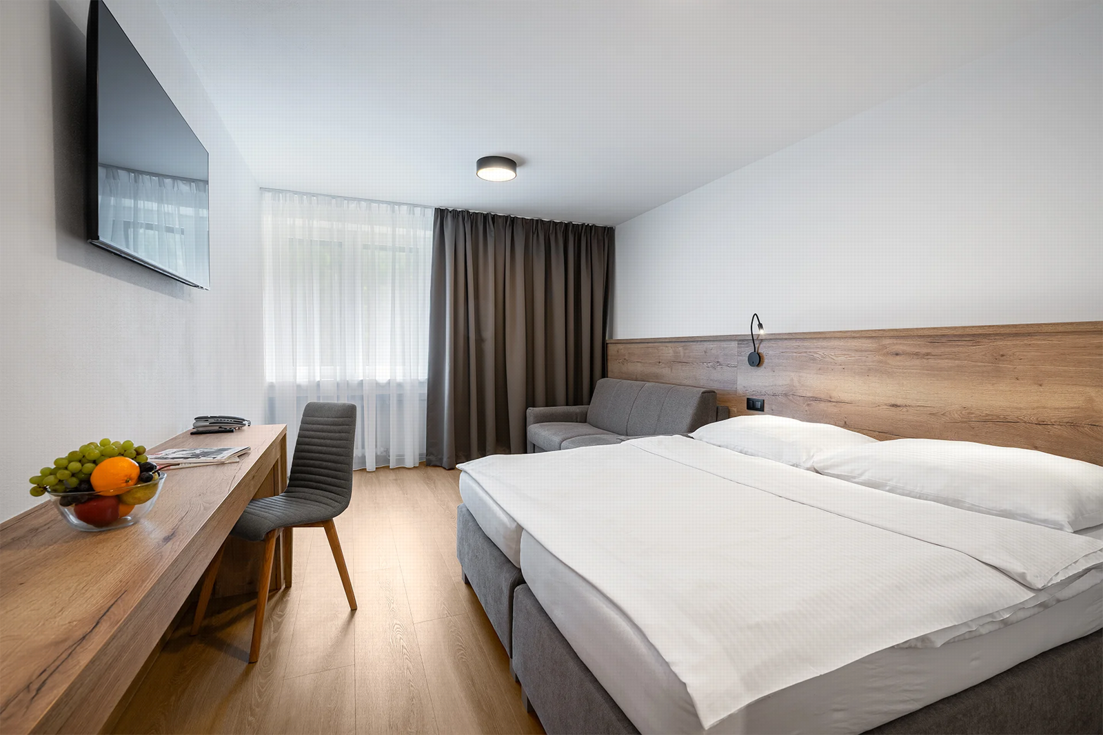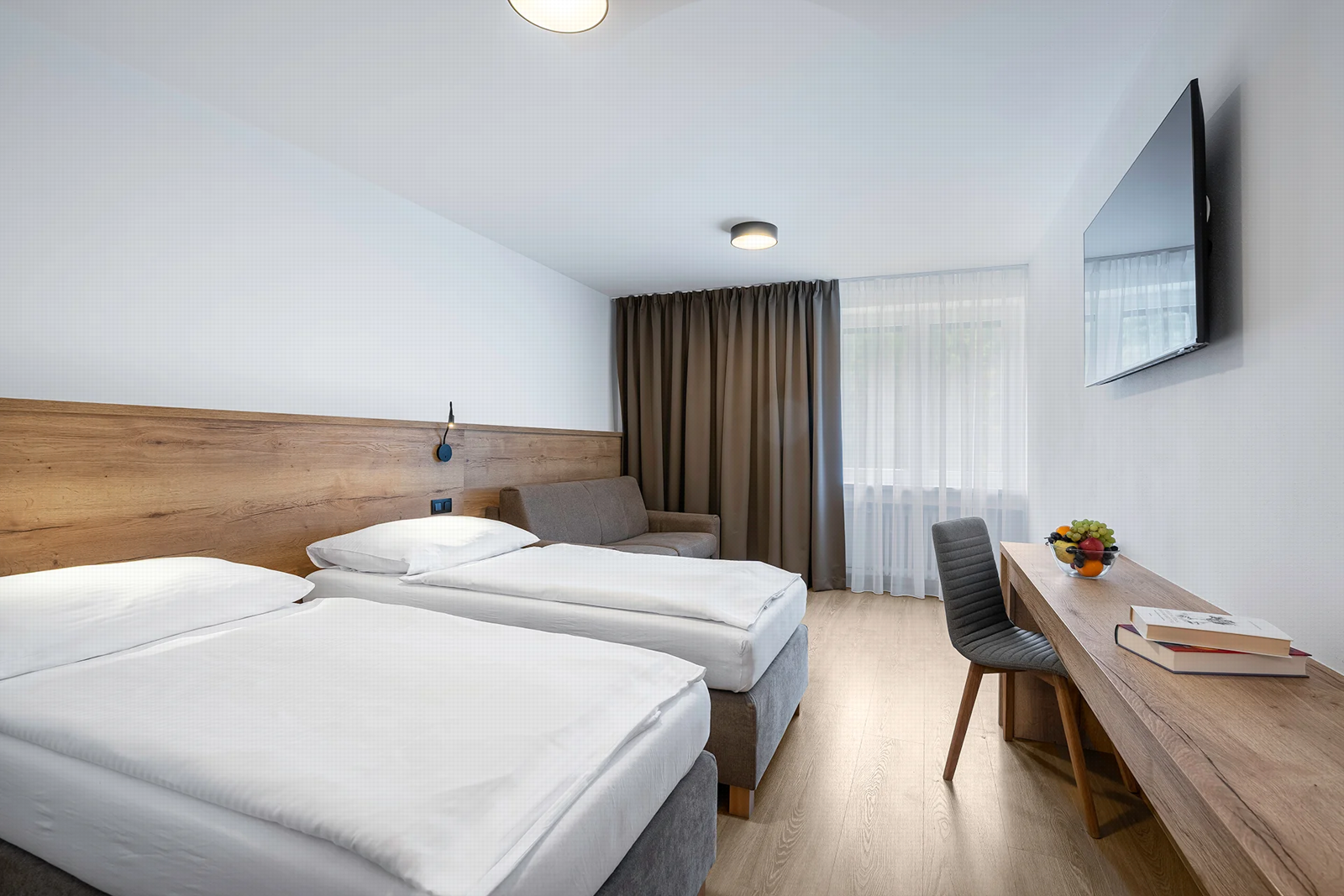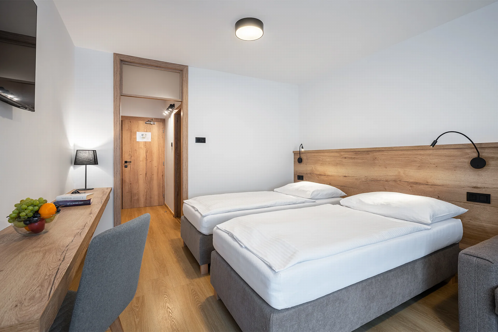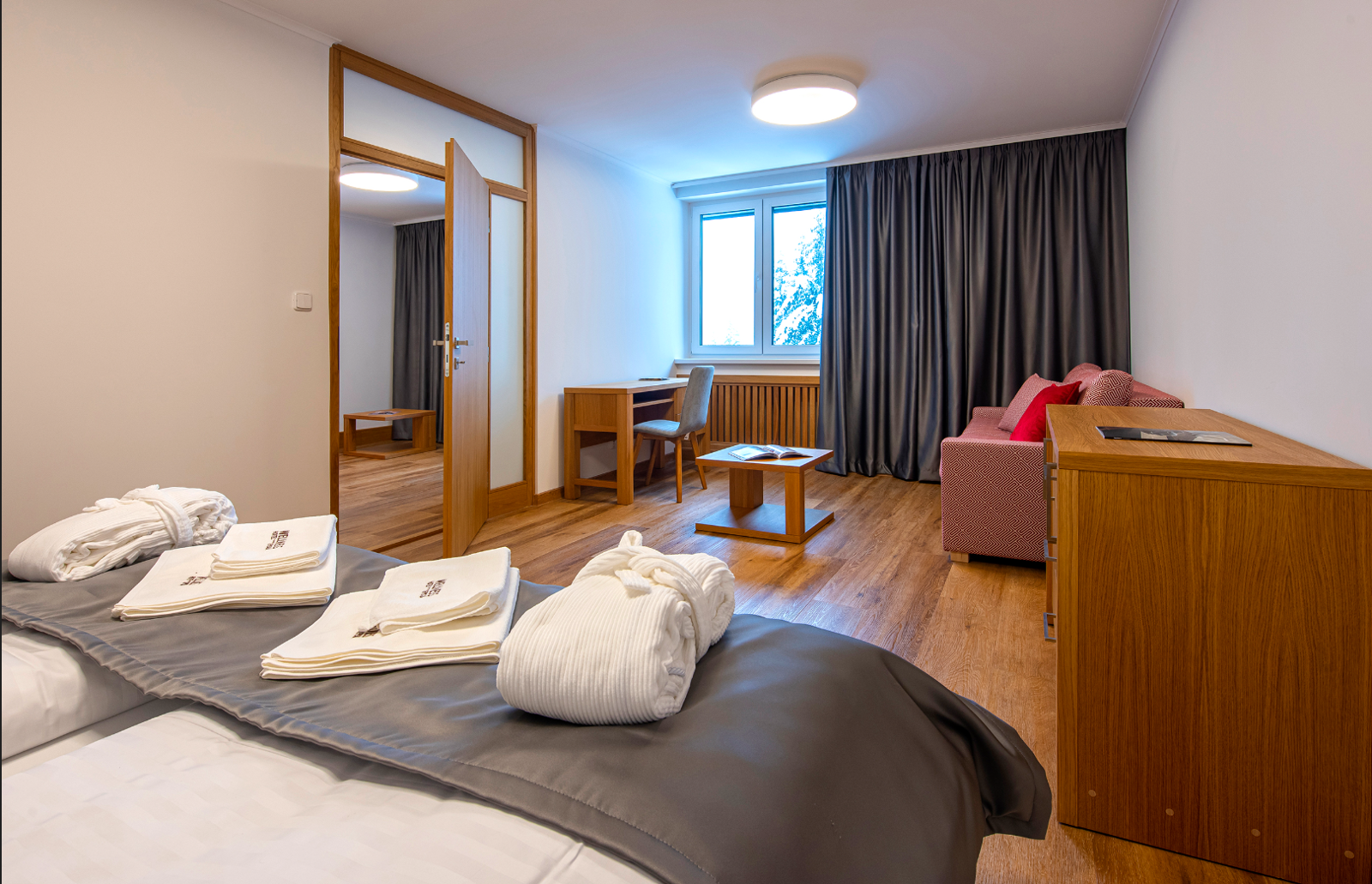 - Dvojlôžkové izby s možnosťou jednej alebo dvoch prísteliek s vlastným sociálnym zariadením, telefónom a farebným televízorom so satelitným príjmom programov