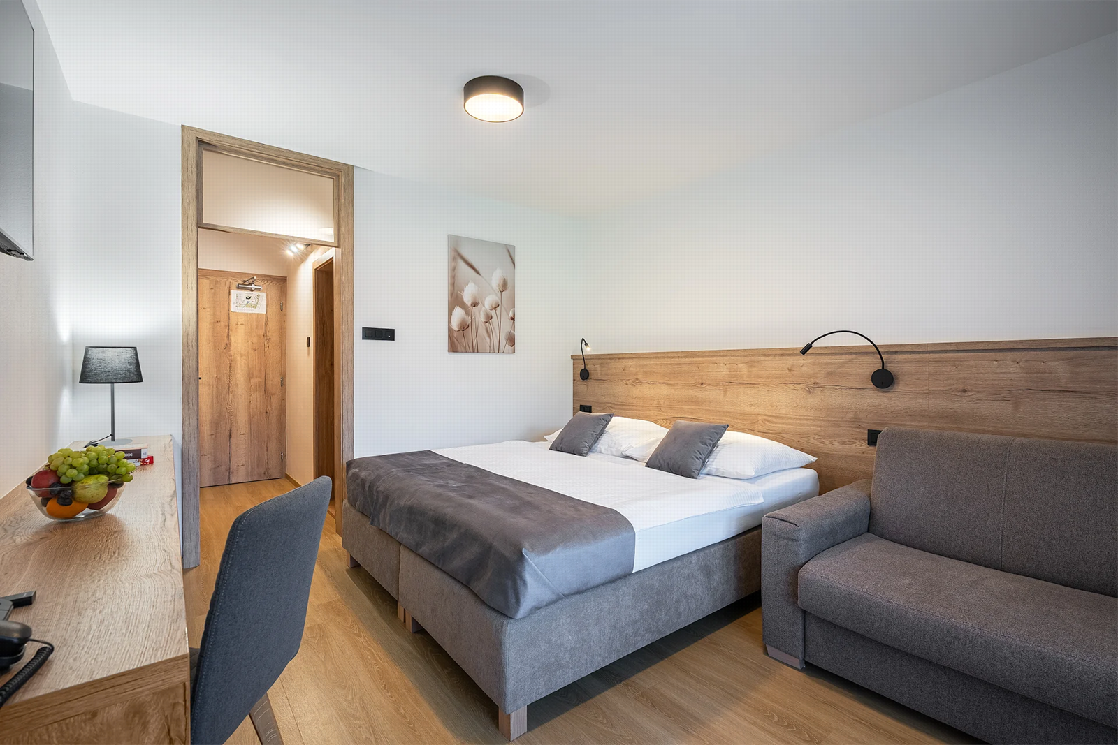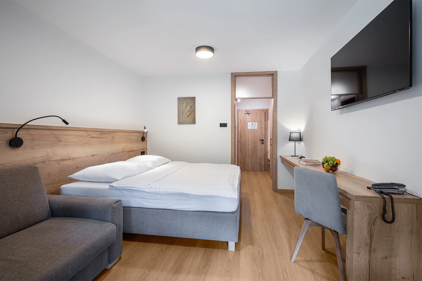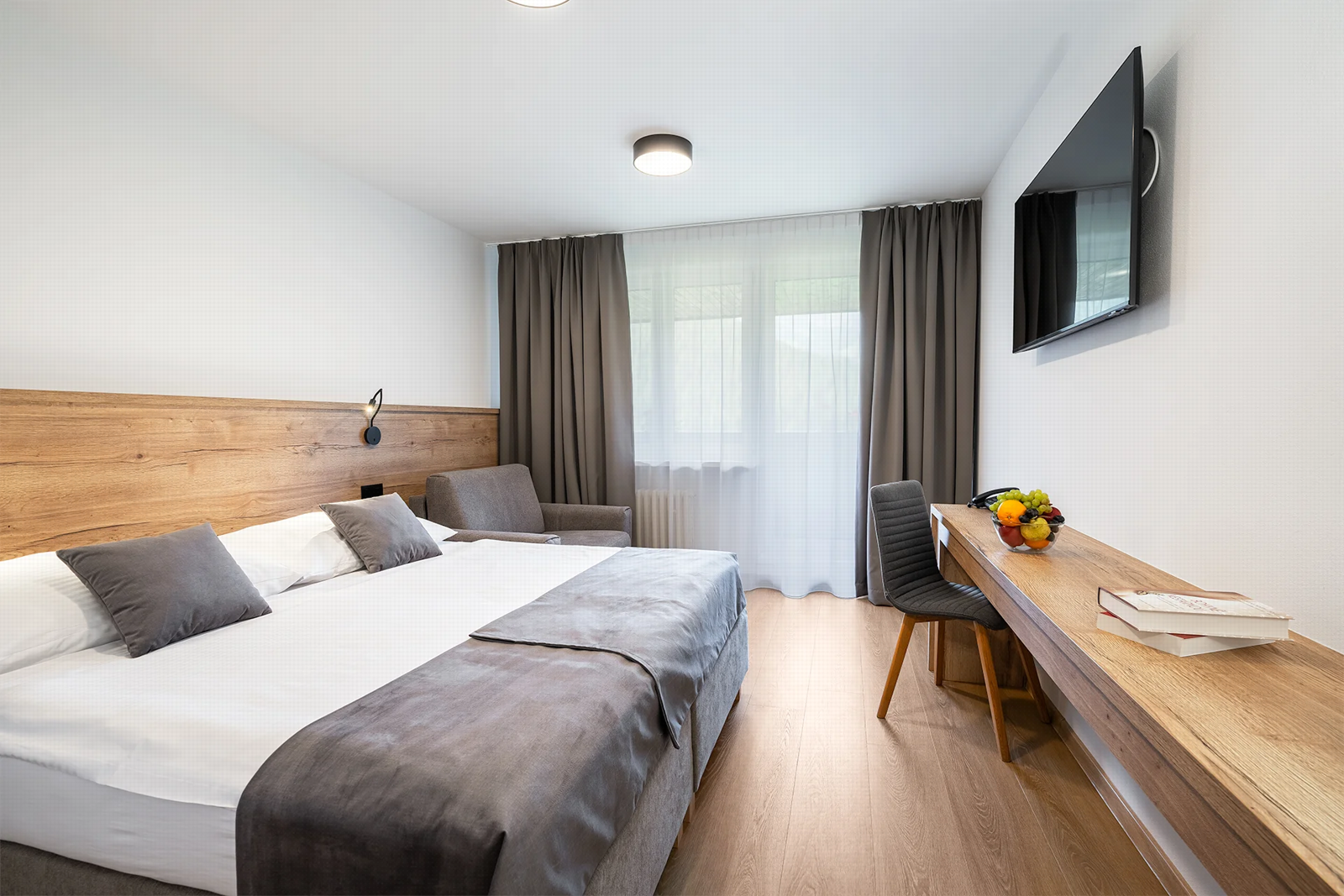 - Dvojlôžkové izby s možnosťou jednej alebo dvoch prísteliek s vlastným sociálnym zariadením, telefónom a farebným televízorom so satelitným príjmom programov