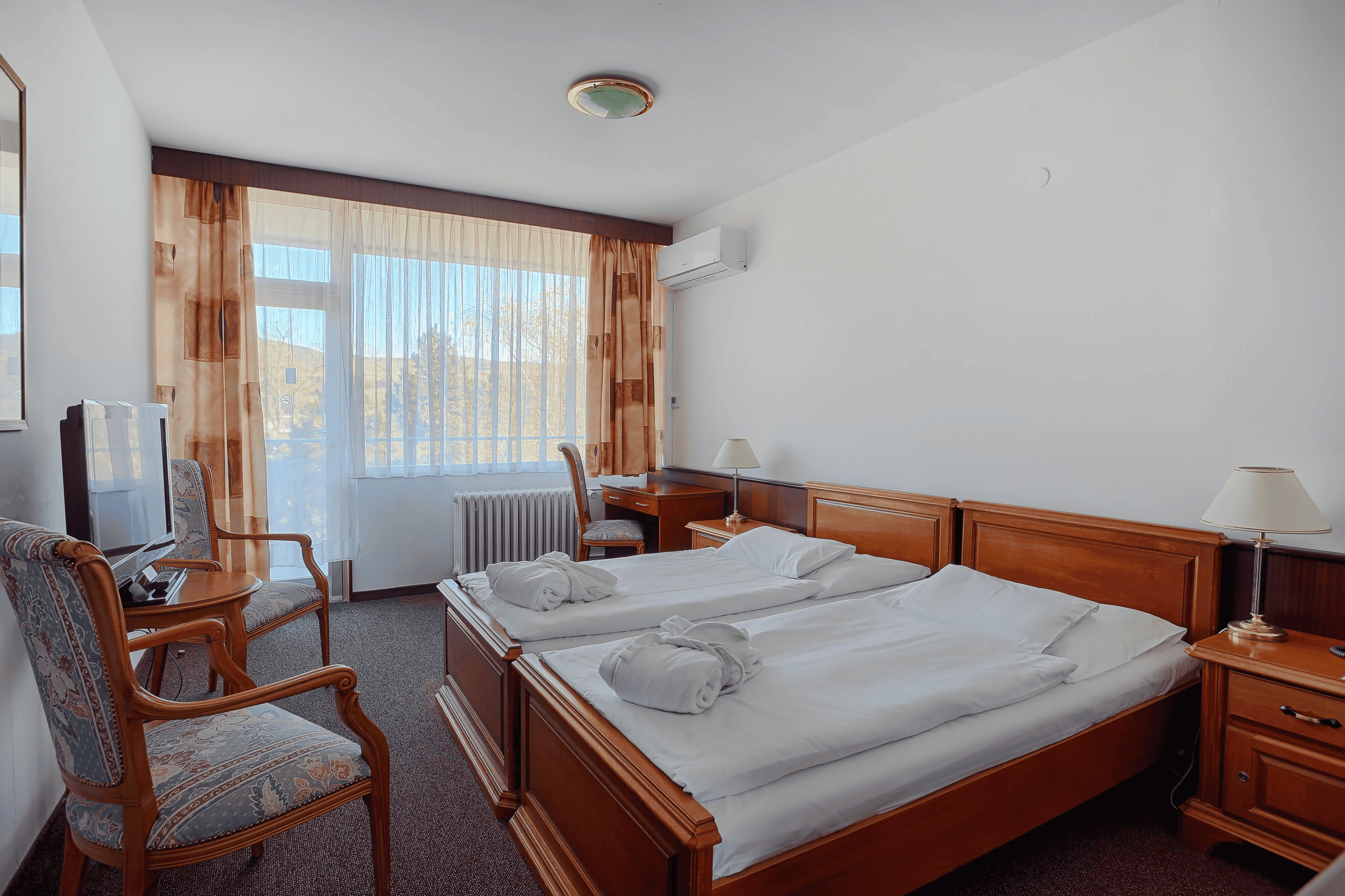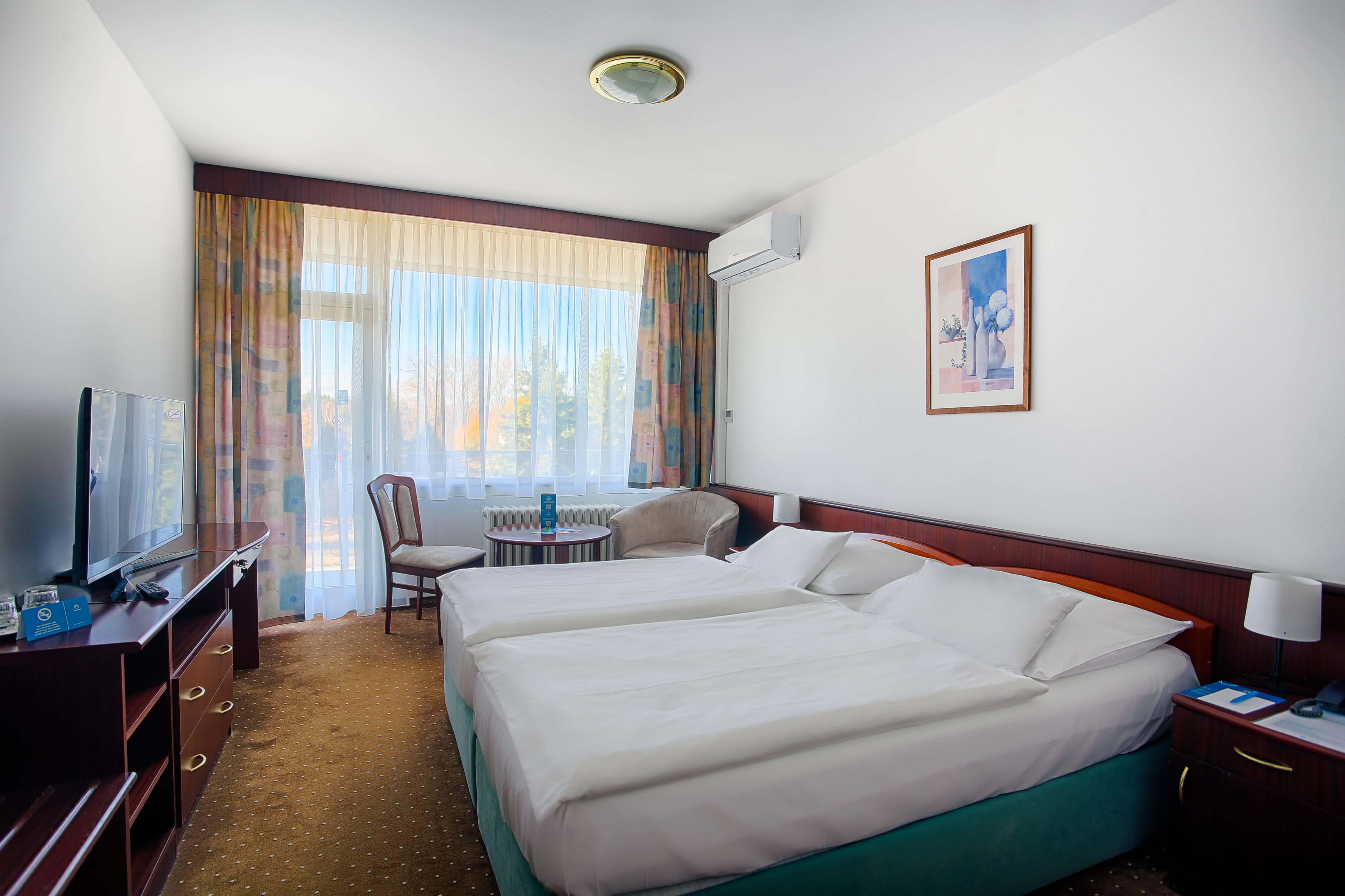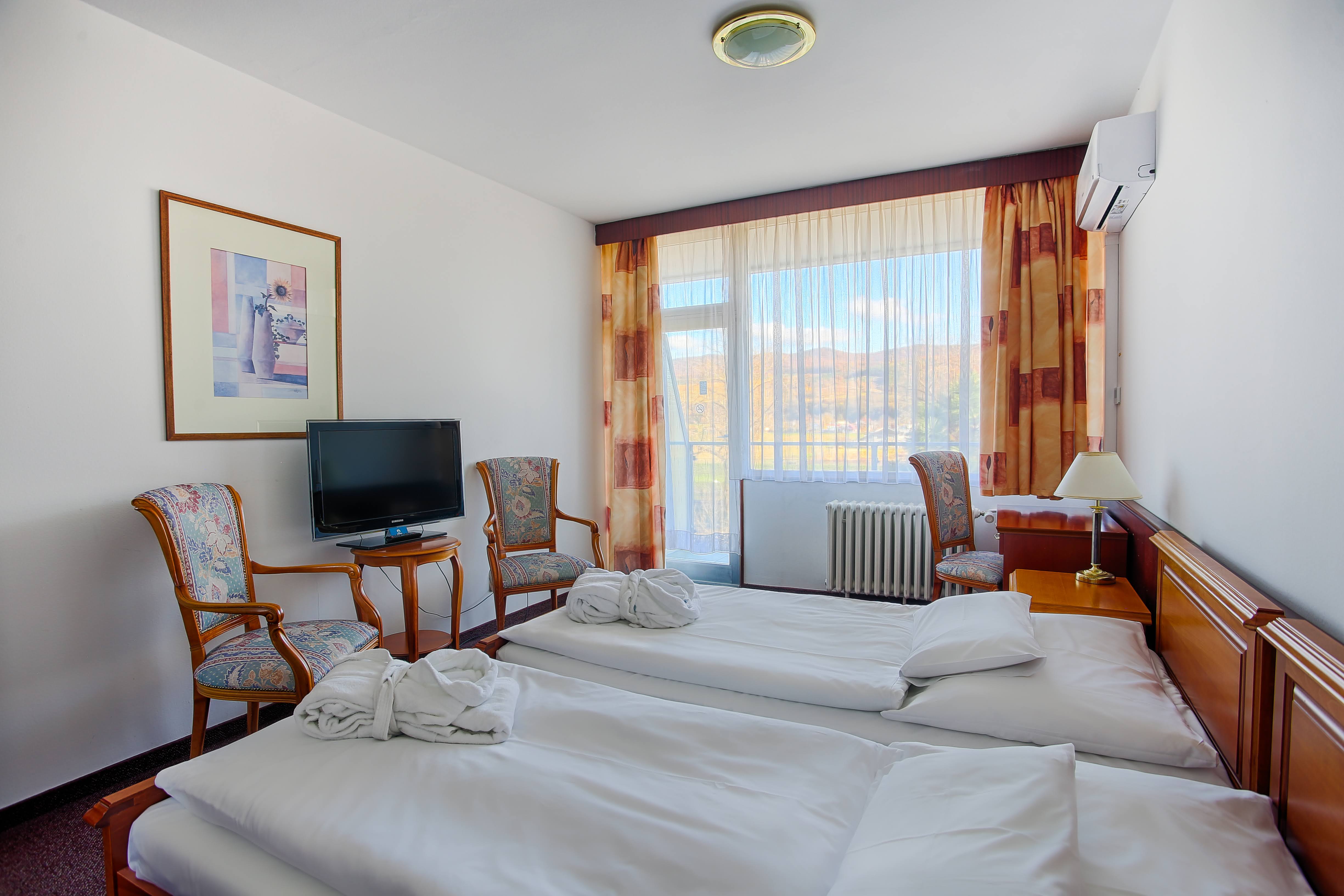 - Komfort izba Komfortná dvojlôžková izba s manželskou posteľou (možnosť prístelky), skriňa, pracovný stôl, kreslá a stolík, LED TV (káblové a rozhlasové programy), telefón, minichladnička, trezor, nástenné zrkadlo a kúpeľňa s vaňou, WC, kozmetické zrkadlo, sušič vlasov a toaletné potreby, kúpeľné uteráky. Izby s klimatizáciou za poplatok.