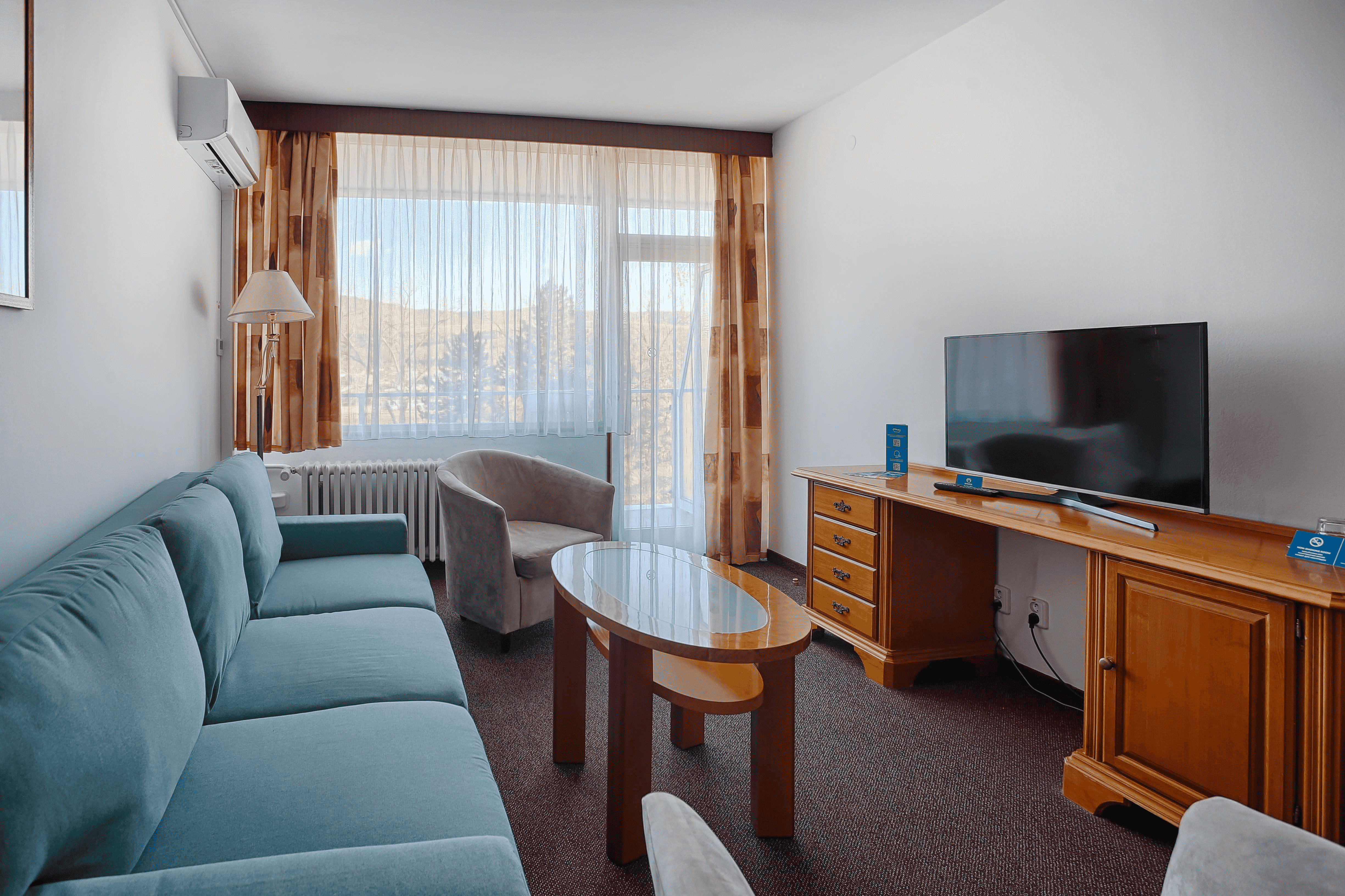 Tradične zariadený klasický menší apartmán s útulným obývacím priestorom so stolíkom a kreslami, stojaca lampa, drevená komoda s LED TV, francúzske okná a balkón, kúrenie, WiFi, samostatná spálňa s manželskou posteľou alebo samostatným lôžkom, pracovný stôl a stolička, LED TV (káblové a rozhlasové programy), telefón, minichladnička s minibarom (naplnenie na požiadanie), nástenné zrkadlo, bezpečnostná schránka, klimatizácia a kúpeľňa s vaňou, WC, bidet, toaletné zrkadlo s osvetlením, sušič vlasov a toaletné potreby, kúpeľné uteráky.